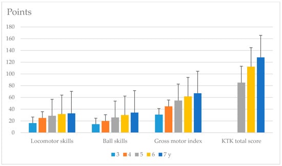 First, all children aged 3 to 7 years completed the TGMD-3 measurements [,]. This process-oriented measurement evaluates the quality of the skills and has two skill categories concentrating on locomotion (LM) and on ball skills (BS). LM skills include a summary of six skills evaluated by the following points: run (0–8 points), gallop (0–8 points), hop (0–8 points), skip (0–6 points), horizontal jump (0–8 points), and slide (0–8 points), resulting in a maximum of 46 points. BS include a summary of seven skills: two-hand strike of a stationary ball (0–10 points), one-hand forehand strike (0–8 points), one-hand stationary dribble (0–6 points), two-hand catch (0–6 points), kicking a stationary ball (0–8 points), overhand throw (0–8 points), and underhand throw (0–8 points), resulting in a maximum of 54 points. An educated observer, who analyzed the skills according to the fulfilment of the given criteria (three to five criteria for one skill), evaluated each skill (0 points if the given criteria were not fulfilled and 1 point if they were fulfilled). Children performed each skill twice, and the recorded score was the sum of the received points of these two performances (maximum of 2). The TGMD-3 gross motor index was the sum of LM skills and BS, with a theoretical maximum of 100 points. The gross motor index itself is the most reliable test score [].