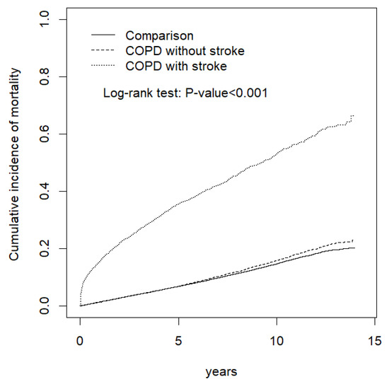 Patients with COPD who had a stroke event had a significantly higher cumulative incidence of mortality (p < 0.001) compared with the patients with COPD who had no stroke event and those in the comparison subgroup (Figure 1).