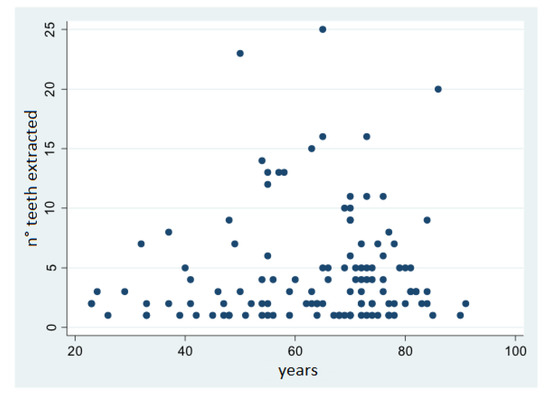 Moreover, the mean age of the population in our study was relatively high (63.3 ± 15.8 years) compared to those in other studies, ranging from 23 to 91 years of age, showing no data of tooth extraction for orthodontic issues [5,8,33,34,35].