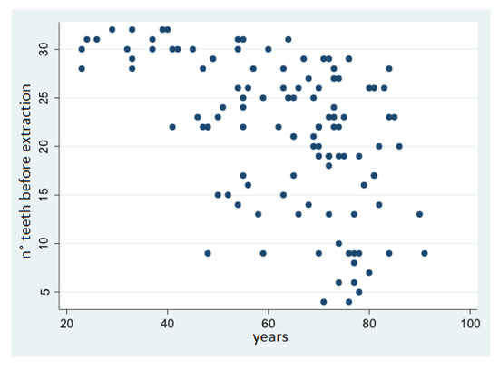 The association between age and patients’ dental status was explored and is shown in the scatterplots in Figure 1 and Figure 2. There was a rather strong association between age and the number of teeth before extraction (Pearson R = −0.51) and after extraction (Pearson R = −0.45), while there was a weak association between age and the number of teeth extracted (Pearson R = 0.07).