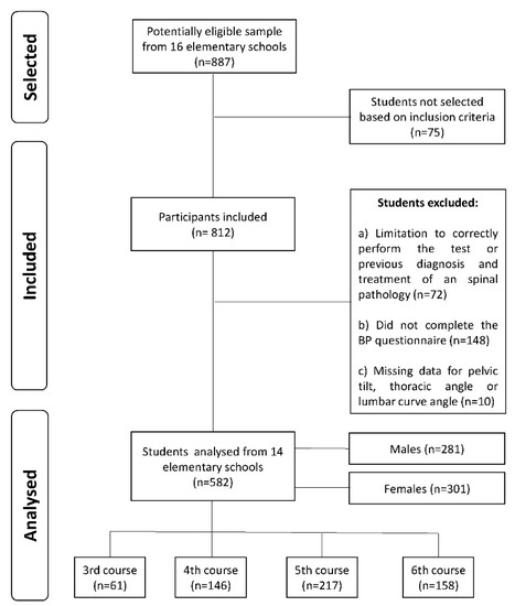 As inclusion criteria, those who were in 3rd–6th grade and were from 8 to 12 years old (a), who attended the day of the assessment (b) and who delivered the signed written consent (c) were included (n = 812). However, those who had suffered an important physical injury which limited the correct performance of the test (a), who had been previously diagnosed to have scoliosis or who had previously received treatment for any frontal or sagittal plane-related pathology (b) or those who did not complete the BP questionnaire (c), were excluded (n = 220). In addition, some cases were excluded due to missing data for one of the variables (pelvic tilt, thoracic angle or lumbar curve angle) (n = 10). Furthermore, the statistical analysis was performed with 582 students from 14 elementary schools (Figure 1).