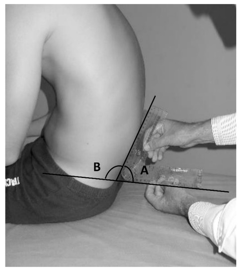 Measurement of the lumbosacral angle (LSA) in a slump sitting position. (A) recorded angle; (B) supplementary angle.