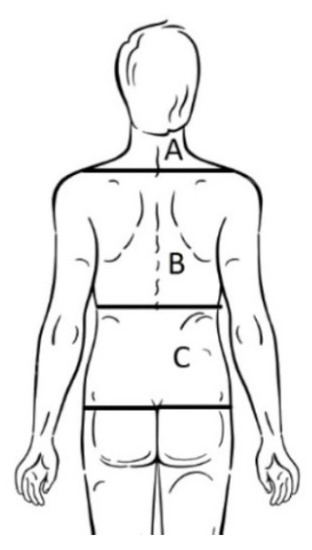 The survey starts by asking questions based on socio-demographic issues such as sex, age, school, course and pathologies. After that, it is asked about BP suffered during the preceding year or week. BP was defined as aching, pain or discomfort in some part of the back that was not related to trauma or menstrual pain [46]. The questionnaire included a drawing of the back to mark the back area where the pain was suffered (Figure 4). If the back pain in the previous year was suffered as a one-time event or was experienced more than once was also evaluated.