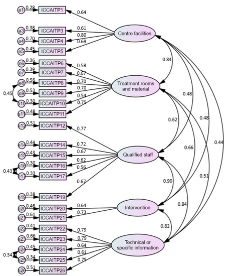 The Inventory of Quality in Early Intervention Centres (IQEIC) [15] was adapted to determine the valuation of ECI service quality from the perspective of professionals who work in EI centres, obtaining an adequate fit to the data (χ2;/gl = 2.53, CFI = 0.94, TLI = 0.92, IFI = 0.94, RMSEA = 0.059). This questionnaire is originally composed of 26 items distributed in four dimensions following the structure of the model proposed in the study of Romero-Galisteo et al. [15]. The first dimension is called “centre facilities” (CF), and it comprises the items related to accessibility, location and adequacy of the facilities; the second dimension would be “treatment room and material” (TRM), which groups the items related to the state of both the treatment rooms and the materials used in them; the third dimension, called “qualified staff” (QS), evaluates the professionals; and the last dimension, called “technical or specific information” (TSI), is related to the more specific and detailed information given to the families.