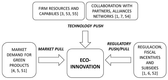 The literature on the drivers of eco-innovation has been increasing [,,] and three main drivers have been identified: the market pull [,,], the regulatory push/pull [,,], and the technology push [,,,,,] (see Figure 1).