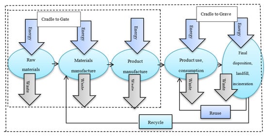 The Society of Environmental Toxicology and Chemistry established the LCA methodology formerly in the aim of reducing resource consumption and environmental burdening of products [78,79,80]. Principally, there are four major steps of an LCA, which include: goal and scope, inventory analysis (LCI), impact assessment (LCIA), and interpretation [81]. The LCA method provides guidelines for materials selection, which quantifies and compares inflows of materials and energy and outflows of emissions of materials on an LC perspective for possibilities of improvement. Figure 1 shows the LC of products from the cradle to the grave.