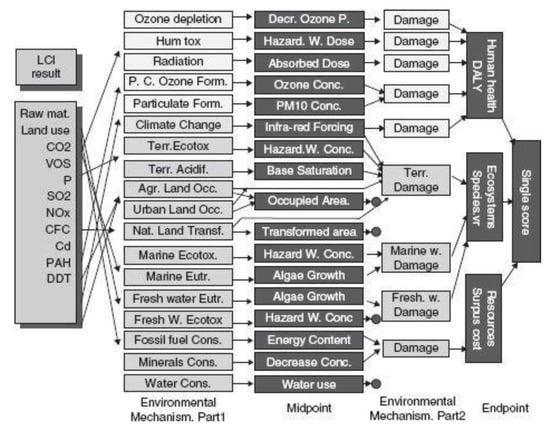 In addition, the life cycle inventory (LCI) for the acquisition of raw materials information is achieved from Eco-invent, Industry data, and U.S. Life Cycle Inventory Database (USLCI) libraries [104,105,106]. Totally, SimaPro contains a number of impact assessment methods, which are used to calculate impact assessment results. In this research, the ReCiPe method was considered for LCIA form SimaPro methods’ library, that it was created by Netherlands National Institute for Public Health and the Environment (RIVM), institute of the Faculty of Science of Leiden University (CML), PRé Consultants, Radboud Universiteit Nijmegen, and CE Delft [85]. ReCiPe is the most recent and harmonized indicator approach available in LCIA. In ReCiPe, the user can choose midpoint indicators or endpoint indicators for interpreting for this quantitative list of emissions [107]. Under the endpoint approach, total impacts are grouped into general issues of concern such as human health, natural environment, and resources [108,109].