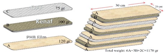 Composite manufacturing methods vary based on composite form, the fiber type, and the matrix type. Additionally, manufacturing method and volume fraction greatly affect biocomposite behavior. Heat and pressure are usually applied for manufacturing composites. In this study, based on the compression molding and laminate method, the biocomposites were made from polymer films and kenaf and OPF fabric. Preparation of the kenaf–OPF hybrid PHB biocomposite plate required two steps, PHB film and NF preparation. Previous research has developed various specific biocomposites in terms of mechanical properties, which determined the best layer arrangement for hybrid biocomposites [103]. The tensile and flexural test of woven kenaf bast fibre/oil palm empty fruit bunches (KBFw/EFB) hybrid reinforced PHB biocomposite with 11 layers revealed that this sample has the capability to replace with some wood and woody production as non-structural building materials. Figure 3 shows the sample layout of hybrid biocomposite with 11 layer laminate (three layers kenaf mat, two layers OPF mat, and six layers PHB film). The sample arrangement has variety in reinforcement and matrix percent. In this study, based on mechanical properties of biocomposite; the percentage of NFs/biopolymer is around (33%/67%), and the percentage of kenaf/OPF is around (33%/67%). For the preparation of GFPP and GFPE, the percentages of fiber and polymer are the same.