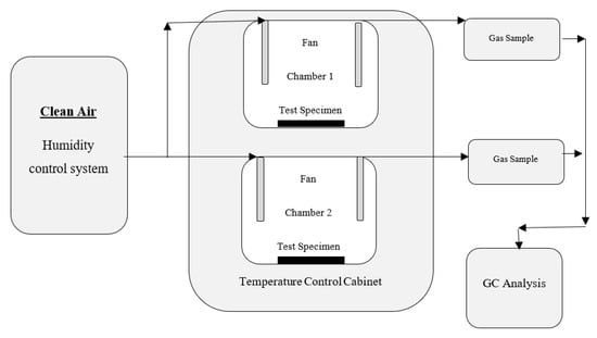 This part of the study focused on concluding the emissions of organic compounds from indoor materials with small-scale environmental test chambers. The evaluation of indoor air pollution from bio-based and petroleum-based composite as non-structural building materials is measured in conformity with the ASTM designation: D5116-10 [110]. Experimentally, a small chamber technique is available for evaluating organic emissions from indoor materials in the building. A facility considered and functioned to control organic emission rates from building materials includes test chambers, clean-air generation system, monitoring and control systems, sample collection and analysis equipment, and standards generation and calibration systems. Figure 4 is a schematic showing an example system with two test chambers. The clean air–humidity control system has an air providing part, a humidifier, and a ventilation system to cleanse the air.