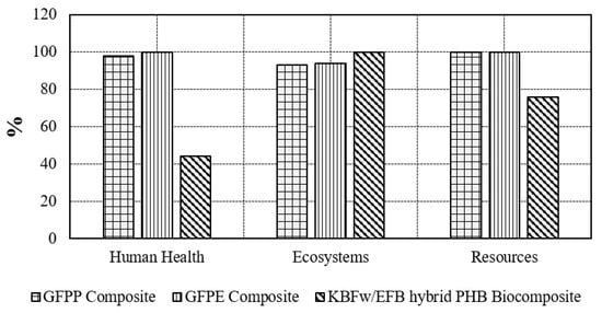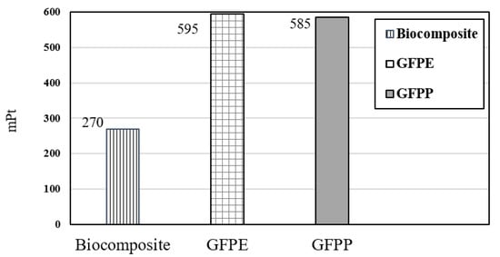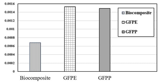 Based on normalization results (Figure 8), the impact category on human health declined noticeably from 0.0015 to 0.00065 on substitution of petroleum-based composite (GFPP and GFPE) with fully biocomposite materials.