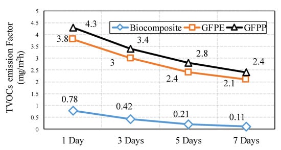 Figure 10 shows the TVOCs emissions, which were detected 1, 3, 5, and 7 days after the preparation of the sample. According to these results, the TVOCs emissions of all of the samples declined during the seven days of monitoring. Biocomposite has lower emission of TVOCs in compare to other materials. Moreover, the difference in TVOC emission between biocomposite and petroleum-based composite was very high. The amount of TVOCs of biocomposite monitor from 0.78 (mg/m2h) on the first day and gradually decreased until 0.11 (mg/m2h) in seven days. However, the TVOCs emission of GFPP was higher than that of GFPE; the amount of VOCs from both sharply decreased during the seven days of monitoring. The higher rate TVOCs emissions belonged to GFPP on the first day (around 4.3 (mg/m2h)), and its sharply declined around 50% for seven days to 2.4 (mg/m2h).