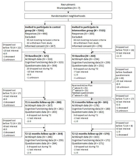 Figure 1 displays the flow diagram of the study. The measurements of cognitive functioning (CF) are outside the scope of the current study. Participants in both conditions were asked to wear an accelerometer for 7 consecutive days on their right hip. All participants received both a paper-based (with a prepaid return envelope) and an online questionnaire (integrated into the project website: www.actief-plus.nl) with the choice to fill out their preferred format within two weeks. So the objective PA measurement preceded the subjective measurement. Thereafter, the 4-month lasting intervention commenced for the experimental group. Six and 12 months after the first accelerometer measurement, participants wore that device again and completed a questionnaire following the same procedure as the baseline measurement. After the final assessment (i.e., after 12 months) participants in the control group received access to the Active Plus intervention (i.e., waiting list control group).
