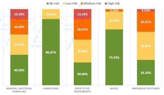 The OHSD staff of the enterprise were asked to classify each of the selected workstations in terms of several ergonomics risk factors (manual material handling, vibrations, repetitive movements, noise, and improper postures). The OHSD staff assigned a risk level (0—No risk, 1—Low risk, 2—Medium risk, and 3—High risk) to the tasks developed in each workstation for each ergonomics risk factor. The results of the classification showed that three risk factors were significant in the tasks developed by the workers participating in the study: manual material handling, repetitive movements, and improper postures (Figure 1).