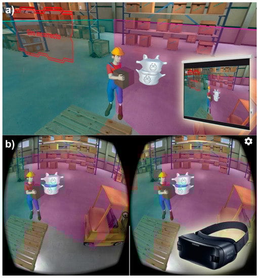 The most common ergonomics risk factors in European industrial environments are repetitive movements, improper postures, handling heavy loads, noise, and vibrations []. The last two factors were not significant among the workstations considered in this work (Figure 1). Therefore, we focused the contents of the training on the first three risk factors. Two different media were chosen to develop and deliver the training. The first one was a plain video presentation shown on a projection screen (Figure 2a), and the second was a 3D interactive environment running on a VR headset (Samsung Gear VR) (Figure 2b).