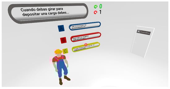 The learning level of Kirkpatrick’s framework for training evaluation [] offers data on the extent to which the knowledge or skills of the participants have changed through a knowledge test. In this work, a multiple-choice test (LT) consisting of 30 questions (10 about each ergonomics risk factor) with three alternatives was used. The participants answered the LT test twice. One of them was filled out immediately after the presentation of the learning contents and the second one was answered three months later. The first time, the participants of the Gr3D experimental group, who received the training using the VR headset, filled out the test in the same application used to view the learning contents in 3D (Figure 3). The members of the GrV group filled out a web form. In the second round, all the groups used the web-based version of the test.