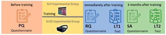 Seventy workers took part in the training. Two experimental groups (GrV and Gr3D) composed of 35 workers were created randomly, assigning each worker to one of the groups. The content of the training was presented to the group GrV using a plain video presentation shown on a projection screen. The workers of the group Gr3D used a VR headset (Samsung Gear VR). VR system users are prone to motion sickness when using a VR system. Motion sickness is a term used to describe the symptomatology of maladaptation syndrome, caused by various synthetic experiences, like using a VR system []. Therefore, three weeks before the training sessions, the workers of the group Gr3D were informed about the use of the VR headsets in the training and were asked if they had felt motion sickness if they used a VR system before. No worker declared ever having suffered motion sickness associated to using a VR system.