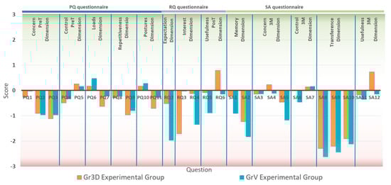 Initially, 70 workers took part in the training and answered the PQ and RQ questionnaires and the LT knowledge test. One of the participants of the GrV group (GrV26 in Table A3) did not complete the LT test and the SA questionnaire in the second round because he no longer worked in the company. Figure 5 shows the average response to each question by experimental group. To elaborate this figure, a score was given to each answer of the scales ranging from −3 for the lowest level of the scales (strongly disagree, never, and not important at all) to +3 for the highest level (strongly agree, very frequently, and very important).