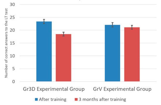 As aforementioned, there were no significant differences between the groups in the scores of the LT knowledge test filled out just after the training. Therefore, it seems that the media used to deliver the training did not affect the level of knowledge or skills acquired by the participants. However, the results of the same test filled out three months after the training showed significant differences between the groups (t (67) = 3.11, p = 0.003). The LT2 column in Table A3 and Table A4 showed the difference between the number of correct answers given to the LT test in the first round and in the second round. Although the results were similar for the participants of the two groups in the first round, the scores in the second round (GrV: M = 18.47, Gr3D: M = 21.14) were better for the participants who used the VR headset during the training (Figure 6). An ANCOVA was performed on the LT1 scores with the scores of LT2 as the covariate. The results (F (1, 66) = 9.79, p = 0.003) showed that the media used to deliver the training significantly affects how the knowledge acquired was retained over time.