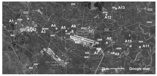 NBIA has two parallel runways in the east-west direction (11L–29R and 11R–29L). Since the operational direction of the runway is influenced by the wind direction, the use of the flight path toward the east occupied nearly 90% of the total movements at NBIA. As shown in Figure 1, in the surveys from 2014 to 2018, there were a total of 13 sites (Sites A1–A13); these included three sites (A5, A6, and A8) located close to the end of the runway of the airport, and two sites (A12 and A13) located in the northeast direction of the airport. The sites A12 and A13 have almost the same living environment as the other sites but aircraft noise was assumed to have an insignificant effect on them.