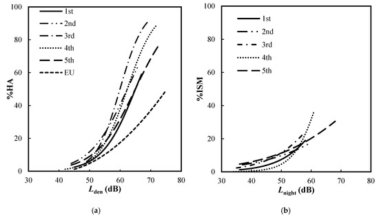 The same categories were created for ISM and Lnight. According to the results obtained from logistic regression analysis, the noise change and survey factor represented by the four dummy variable significantly affected the prevalence of annoyance and ISM except in the category of “ΔLden ≤ 0, 4th & 5th” in the estimation for annoyance and “ΔLnight ≤ 0, 2nd & 3rd” and “ΔLnight ≤ 0, 4th & 5th” in the estimation for ISM.