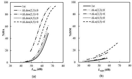 The exposure-response relationships found in Table 7 and Table 8 are presented in the form of graphs in Figure 3. Figure 3a compares the Lden–% HA relationships in the 1st survey and four categories of ΔLden and Figure 3b compares the Lnight–% ISM relationships in the 1st survey and four categories of ΔLnight which are listed in Table 7 and Table 8. The categories of noise exposure level which is less than or equal to the first survey are slightly higher and almost coincided with the curve drawn for the first survey in the case of annoyance and insomnia, respectively. On the other hand, the categories of noise level which were greater than those in the 1st survey were significantly higher than those of the curve drawn for the 1st survey.