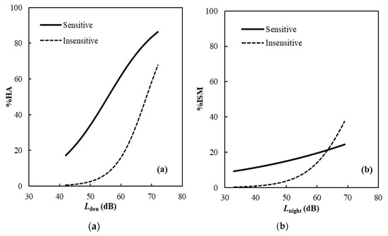 In order to further examine the interaction effect on annoyance and ISM of noise sensitivity and noise exposure factors, the Lden–% HA relationship and Lnight–% ISM relationship were compared between the sensitive and insensitive respondents (Figure 4). The curves in the model of ISM are reversed at the noise level range of above 63 dB, as a whole, the sensitive group is more responsive to noise exposure than the insensitive group regarding both the annoyance and ISM. This result indicates that the effect of noise sensitivity is reduced in the areas having high levels of noise exposure, or the higher level of noise exposure might saturate the effect of noise sensitivity. In other words, the noise sensitivity was more pronounced at moderate noise level exposed than at high noise level exposed areas.