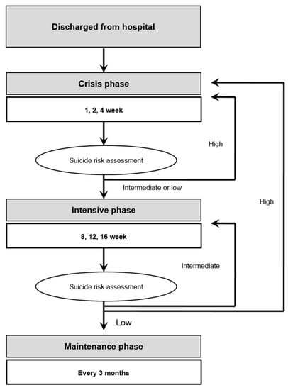 - Crisis management and suicide risk were conducted in weeks 1, 2, and 4. If the suicide risk was high, the attempters underwent crisis management again, but if the risk was low, the attempters went through intensive management until week 6.