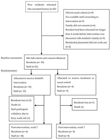 - Hayward, J.; Nunez, K.; Ballard, C.; Spector, A. Healthy adjustment for new residents with dementia using SettleIN: A feasibility study with staff in UK care homes. Dementia 2018, 24, 471301218806082. [Google Scholar] [CrossRef]