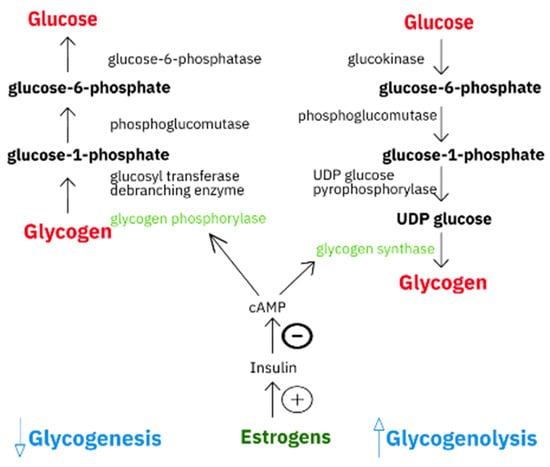 The relationship between estrogen concentration and metabolic homeostasis has also been found in a study carried out on aromatase-deficient patients and aromatase-knockout animals (ArKO mice); these patients, such as a male patient with inactive ERα [15], displayed diminished glucose metabolism, insulin resistance and hyperinsulinemia [16]. Exogenous estrogen supplementation of the male patient with attenuated ERα did not recover homeostasis of glucose and did not restore insulin to normal level, whereas the aromatase-deficient patients revised their metabolic anomalies [15]. Estrogen supplementation increases synthesis and release of insulin [17,18], and may also change liver GLUT expression [1]. Therefore, these sex hormones are important in hepatic insulin clearance. Postmenopausal women, after an oral hormone replacement therapy (HRT) at low doses, did not show any changes to IR but exhibited a slight increase in hepatic insulin clearance [19]. Estrogens also reduce gluconeogenesis and increase liver glycogen synthesis and storage, and lower blood glucose levels [20]. As well as this, observations on ovariectomized (OVX) rodents support the view that estrogens decrease glucose levels [21,22]. This correlates with increased glucagon signalling due to an increased expression of the glucagon receptor (GLR), which stimulates glucose production by activating gluconeogenic enzymes in OVX rats [23]. As a glucose imbalance after an ovariectomy is not reversed by exogenous E2 [23], it can be assumed that this disturbed homeostasis was due to a lack of progesterone. While the classic, nuclear progesterone receptor (PR) has not been detected in the liver [24], progesterone—in addition to binding to membrane PR [25]—can also bind to the nuclear AR [26] and thus induce metabolic effects in human hepatocytes, similar to hepatic glycogenolysis and gluconeogenesis regulated by the epinephrine/β2-adrenergic receptor pathway as a result of estrogen action [27].