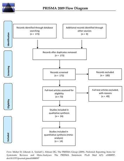 - Liberati, A.; Altman, D.G.; Tetzlaff, J.; Mulrow, C.; Gøtzsche, P.C.; Ioannidis, J.P.A.; Clarke, M.; Devereaux, P.J.; Kleijnen, J.; Moher, D. The PRISMA statement for reporting systematic reviews and meta-analyses of studies that evaluate healthcare interventions: Explanation and elaboration. BMJ 2009. [Google Scholar] [CrossRef]