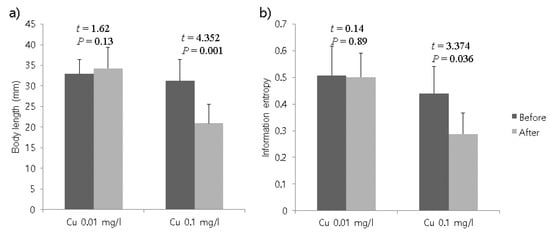 Comparison of total body lengths of Lumbriculus variegatus (a) and Shannon information entropy representing movement of test organisms (b) before and after treatments with copper sulfate at concentrations of 0.01 mg/L and 0.1 mg/L. Paired sample t-tests were conducted to compare the differences in body length and Shannon entropy index before and after treatments. Error bars indicate standard deviation.
