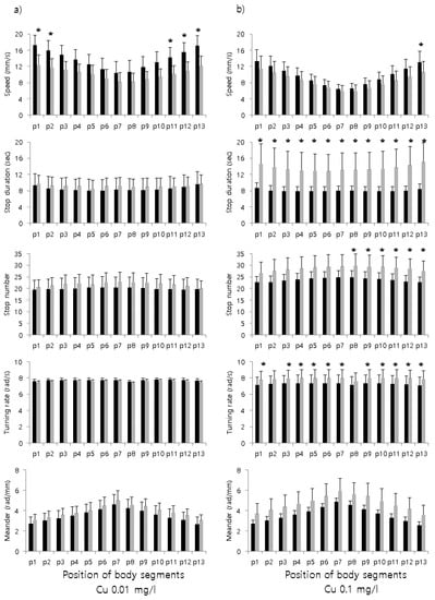 The chemical effects were observed more clearly with 0.1 mg/L compared with 0.01 mg/L. Stop duration and turning rate substantially increased in all or most segments at 0.1 mg/L, respectively (Figure 2). Additionally, a significant increase in stop number was observed in the posterior segments. It was noteworthy that only the last segment showed a significant decrease in speed after treatment at 0.1 mg/L. At the lower concentration of 0.01 mg/L, the difference was not as clearly observable as in the 0.1 mg/L concentration. However, a partial difference was observed in speed according to body segments, with a decrease in both the anterior (p1 and p2) and posterior segments (p11–p13) (paired t-test, P < 0.05; top panel, Figure 2a), indicating that a body response was observed at the lower concentration. According to ANOVA and Tukey’s honestly significant difference test (Table 1), speed and turning rate were divided into two groups, whereas stop duration and meander were not different between the experimental conditions.