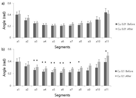 The curvature of the body was represented by a series of angles observed between every consecutive pair of body segments, creating an extra dimension of movement patterns. The patterns of angle changes were different in the different concentrations (Figure 3). The curvature of the head (a1) and tail (a11) varied according to treatment strength of copper, as shown for both the 0.01 mg/L (Figure 3a) and 0.1 mg/L (Figure 3b) concentrations. Curvature strongly differed in the middle of the body at 0.1 mg/L. The curvature of the tail (a11) was sensitive to increases after the 0.1 mg/L treatment (0.389 ± 0.033 and 0.494 ± 0.088 for before and after treatments, respectively) (paired t-test, t = 2.247, P = 0.046). Curvatures were not different before or after the 0.01 mg/L treatment in any segment, including the head and tail segments (paired t-test, t = 0.573 and 0.503, P = 0.577 and 0.624 for head and tail, respectively). Curvature specifically at the head segment (a1) was not significantly different between the before (0.393 ± 0.046) or after 0.1 mg/L treatment groups (0.397 ± 0.055) (paired t-test, t = 0.091, P = 0.929).