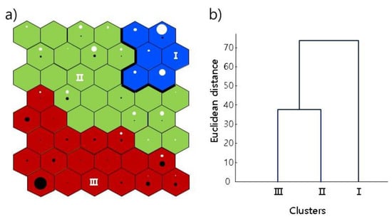 The learning process of the RSOM was conducted with a program developed by the authors in the Matlab environment []. After the learning process, a hierarchical cluster analysis was conducted based on the Ward linkage method with Euclidean distance measures to define the cluster boundaries in RSOM units. A multi-response permutation procedure [], which is a nonparametric procedure to test the hypothesis of no difference between two or more groups, was conducted to evaluate the significance of the clusters defined in the RSOM using PC-ORD [].