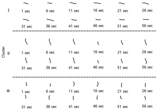 The body movements were correspondingly different in different clusters (Figure 5). Cluster I showed a sequence of large and straightened shapes, cluster II displayed folding shapes, and cluster III represented contracted and folding shapes. As stated above, body shapes in cluster II were mostly movements before the chemical treatment, whereas those in cluster III were mostly movements observed after the treatment. Therefore, body shapes after the chemical treatments were represented by short body lengths with a high degree of folding.