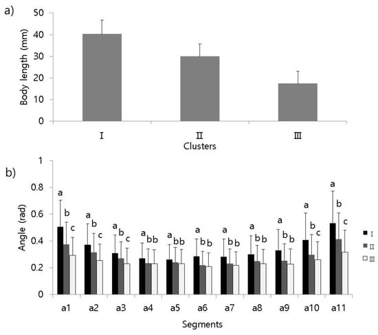 Each movement parameter differed according to different clusters in the RSOM (Figure 6). To compare parameters, 1000 samples were randomly selected from each cluster. The total length in cluster I showed the greatest range among the clusters (Figure 6a), with length also being relatively greater in cluster II, another cluster belonging to the before-treatment group, compared with cluster III, which represented after treatment. The total lengths of each cluster significantly differed from each other (Tukey’s test, q0.05,3000,4 = 3.314; I ≠ II ≠ III) (Table 2). The angles between body segments were also significantly different among clusters. In cluster I, the angles were relatively greater at the end of the body, however, curvatures were greater in the middle part of the body. Patterns in the RSOM were capable of characterizing the sequential line shapes of test organisms before and after treatment.