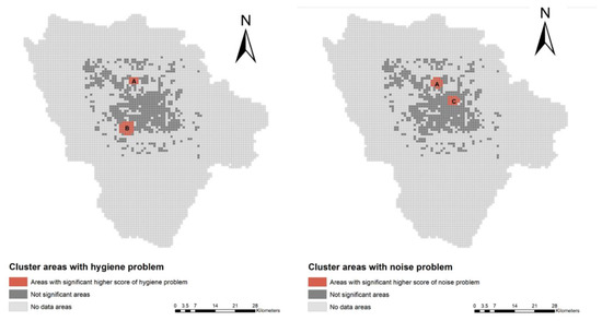 Spatial scan statistic results displaying cluster areas with hygiene and/or noise problems.