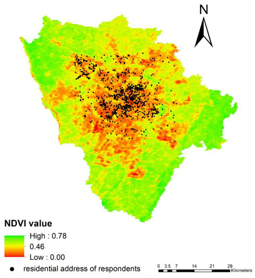 In addition to the spatial scan statistic, the sensor tool was used to measure the objective neighborhood greenness, which is a crucial component of the neighborhood physical environment. The Normalized Difference Vegetation Index (NDVI) values from the Moderate-Resolution Imaging Spectroradiometer (MODIS) were estimated to measure the objective neighborhood greenness [41]. The NDVI value ranges from −1 to +1, with higher values indicating more green space [42]. MODIS is an instrument aboard the Terra satellite which can offer global 250 m × 250 m pixel NDVI value every 16 days [43]. This study created a set of 800 m radius buffer zones according to the residential addressees of respondents to present the neighborhood range of every respondent [44,45]. The neighborhood greenness was measured according to the mean 2018 annual average NDVI value for all 250 m × 250 m pixels within their 800 m buffers. Finally, respondents were dummy-coded as 0 if there was an NDVI value less than 0.3 and 1 if there was an NDVI value more than 0.3, since the low and high density of vegetation can generally be divided by 0.3 [46]. The above geographic information system analyses were conducted through ArcMap 10.2.