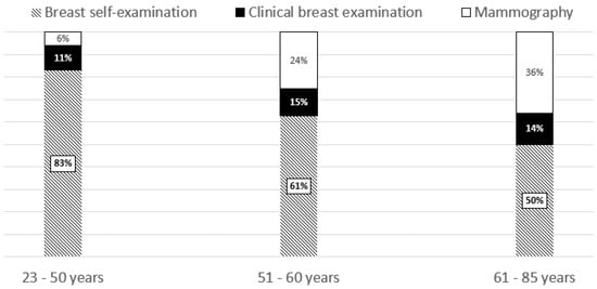 Average age at diagnosis was 56.1 ±10.5 years and varied between 23 and 85 years. The mean time since the diagnosis was 10.1 ± 7.1 with the range 0–37 years. Among three analyzed modes of early detection of breast cancer self-examination was the most frequent method (63.7%), followed by mammography (22.8%) and clinical breast examination (13.5%). The three groups differed (p < 0.001) in terms of age at diagnosis: 54.1 ± 10.8 years in breast self-examination group, 58.7 ± 10.8 years in clinical breast examination group and 60.0 ± 7.6 years in mammography group. Based on the age at diagnosis three age categories were defined: 23–50 years (n = 63; 29.3%), 51–60 years (n = 82; 38.1%) and 61–85 years (n = 70; 32.6%). Figure 1 shows the relative contributions of three examinations according to the age at diagnosis. With increasing age category there was a decreasing frequency of breast self-examination and increasing frequencies of two remaining modes of diagnosis. The differences were statistically significant: p = 0.001.