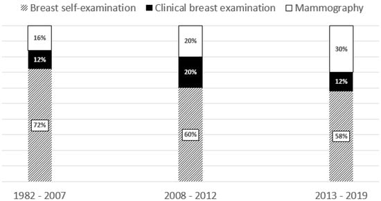 The principal finding of our study is that in the study population of breast cancer survivors (Katowice Region, Poland) breast self-examination remains the most frequent method leading to the detection of breast cancer. Results obtained in 2019 showed that breast self-examination led to diagnosis in 63.7%, clinical examination in 13.5% and mammography in 22.8% of cancer cases. The findings provided by study performed in 2004 showed similar figures: breast self-examination in 58.9%, clinical examination in 19.7% and mammography in 19.2% of cases []. The compared distributions (year 2004 vs. year 2019) did not differ in a statistically significant way: p = 0.1. Moreover the group examined in 2019 and the group examined in 2004 were similar in terms of age at diagnosis: 56.1 ± 10.5 years and 57.6 ± 9.3 years, respectively. Our observation that breast self-examination has remained the most frequent method of detection of breast cancer corresponds with widely known recommendations regarding a need for regular self-examination. The method is convenient and useful but it cannot replace other ways of early detection of breast cancer, in particular mammography []. From that point of view it is somewhat alarming that in the study group mammography was responsible for only 23% of all detected cases. Moreover, positive mammography results were obtained in cancer patients who were on average six years older than the cases identified by self-examination. The gap might reflect a reduced chance of successful management particularly that not a self-examination but a serial screening with mammography is the most effective method to detect early stage disease [,,]. On the other hand such a low ratio of mammography-delivered early diagnoses in our study could reflect the age criterion used in population-based screening program. It is mammography and not self-examination that is effective in reducing breast cancer mortality []. Accumulated evidence was essential in revision of American Cancer Society guidelines that since 2015 advise beginning of annual mammography screening in women aged 40–44 years and recommend annual mammography screening in all women aged 45–54 years, followed by regular screening in women aged 55+ years []. Our findings showed that with regard to U.S. recommended age categories 16 women (7.4%) were aged 40–44 years, 69 women (32.1%) were aged 45–54 years and 120 women (55.8%) were aged 55+ years. The first two figures reveal the potential of increase in early detection in response to changes of the age scheme of population-based screening for breast cancer in Poland.
