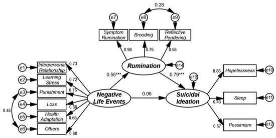 The model of the mediating effect of rumination in the influence of negative life events on suicidal ideation in college students. *** p < 0.001.