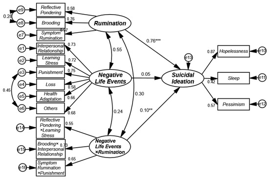 The moderating effect of rumination was tested using the unconstrained approach for potential variables proposed by Wu et al. [38]. In the first step, all variables were normalized; thereafter, the observation indicators of the moderating term were constructed between rumination and negative life events according to the pairing principle for inconsistency in the number of observation indicators described by March et al. [39]. Thus, three indicators of interaction terms were constructed, and the model of moderating effect was constructed, as shown in Figure 2. The results suggested that the model had good fitness indicators (χ2/df = 3.96, p < 0.001, GFI = 0.95, NFI = 0.93, IFI = 0.95, CFI = 0.95, TLI = 0.94, and RMSEA = 0.05). The test results showed that rumination had a significant effect on suicidal ideation in college students (β rumination → suicidal ideation = 0.76, p < 0.001); negative life events did not have a significant predicting effect on suicidal ideation (β negative life events → suicidal ideation = 0.05, p > 0.05); and the interaction term between rumination and negative life events had a significant predicting effect on suicidal ideation (β negative life events × rumination → suicidal ideation = 0.10, p < 0.01). Based on the results above, it was demonstrated that rumination was a significant moderator of the relationship between negative life events and suicidal ideation in college students.