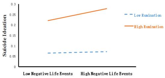We also found that rumination was a significant moderator of the influence of negative life events on suicidal ideation in college students. Specifically speaking, under a high level of rumination, negative life events were more likely to accelerate the emergence of suicidal ideation in college students, which was consistent with the existing research [49]. Evidence suggests that the main characteristics of rumination are repetitive and intrusive thoughts [50], and rumination can lead to depression and extreme anxiety [51]. Confronted with negative life events, college students may lapse into brooding about their impact and the associated negative emotions. Therefore, college students with a high level of rumination are very likely to experience suicidal ideation.