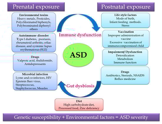 Non-predisposed factors such as exposure to environmental factors and pharmaceutical drugs, autoimmune disorder, microbial infection and diet during the prenatal and postnatal periods cause gut dysbiosis and immune dysregulation together contributing to ASD (Figure 1). Recent research revealed that the severity of ASD depends on the complex interaction of genetic susceptibility and environmental factors, so unraveling this relationship will help in identifying a treatment strategy for ASD [,].