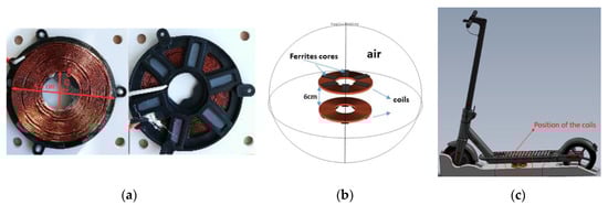 Here, the two coils of our 160 W induction charging system have been modelled in a finite element air sphere with two coils superimposed at a parallel distance of 6 cm. Both coils are constructed from copper with ferrite cores with 17 spires (inner radius = 2.25 cm, outer radius = 5.6 cm), as shown in Figure 1a,b. The transmitter coil is positioned under the chassis of the scooter, as shown in Figure 1c. The system is not shielded due to its adverse impacts on efficiency [25]. However, the system must be shielded when the MF evaluation exceeds the limit to mitigate it.