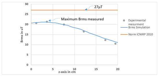 Therefore, the root mean square of the flux density of the magnetic field generated by a 160 W wireless charging system is measured at a position of 20 cm from the centre of the coils as a function of the z-axis (from z = 0 → 20 cm) as shown in Figure 4b. In fact, according to the ICNIRP guidelines, if the source of the magnetic field concern is localized at less than 20 cm from the body, the real evaluation of exposure to MF is to determine the induced electrical field in the body. When the distance exceeds 20 cm, the measure of the MF in the space occupied by the body is possible [1].