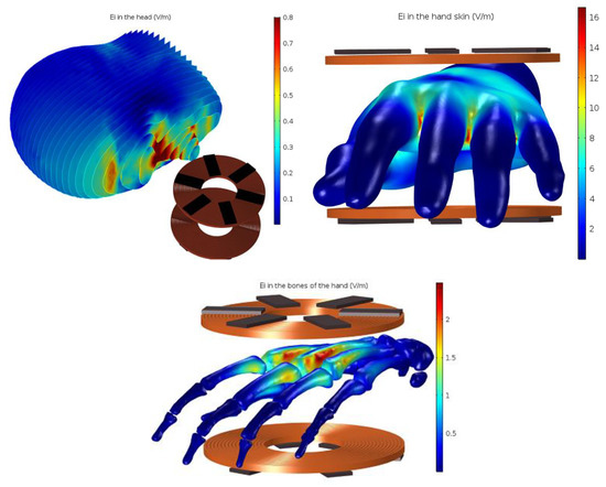 In this part, the authors present and temperature evolution with higher frequencies (100, 500, and 1000 kHz) for the head and the hand. Since the dielectric parameters of biological tissues change in terms of the frequency, the new dielectric parameters were modified for each frequency based on references [31,32].