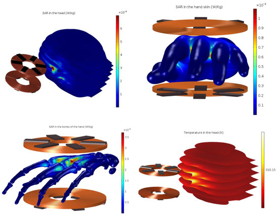 The Federal Communications Commission (FCC) has ruled that FEM is a valid method to simulate the as an alternative method to FDTD. This method is chosen for its advantages over FDTD for unstructured mesh and curved surfaces such as human organs [37]. Furthermore, the local SAR is generally greater than the 1 g or 10 g spatial averaging , and when referring to basic restrictions, values of spatial averaging are limited to 2 W·kg−1 in the head and 4 W·kg−1 in the limbs (general public from 100 kHz to 10 GHz). Our system operates at 30 kHz. However, the minimum frequency specified by the organizations to have a significant heating effect on human tissue is 100 kHz, so our results are compared to this minimum frequency.