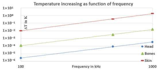 Moreover, in order to show the effect of the energy absorbed as a form of heat, we simulated the bio-heat transfer and equations presented in Section 2 (the human being has been considered in a state of rest, and can therefore be neglected) [21]. The result of the temperature increase in the head is shown in Figure 7. The frequency-stationary study shows that the local increase of temperature in the head, skins, and bones at 30 kHz is equal to K for the head and K for the skin and bones, which is negligibly low and would be difficult to measure in practice, and will, therefore, be disregarded.