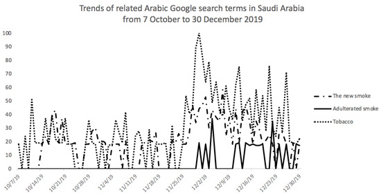 With more voices claiming the cigarettes were adulterated, the GAZT responded on 20 November, 2019 through its Twitter account. It provided images explaining the presence of taxation stamps on cigarette packs as proof of legality [39]. Hashtag users called on each other to file complaints with the Ministry of Commerce and Investment (MCI) for commercial fraud because the expiry dates were not included on the packets. On its Twitter account, the MCI stated that the issue was not under its jurisdiction, and deleted the tweet a few days later. Following this, the Ministry of Health Tobacco Control Program (MoH-TCP) received hundreds of emails and calls over a period of three days on the issue of the new cigarettes. There was also a significant increase in Google searches on the topic (Figure 2).